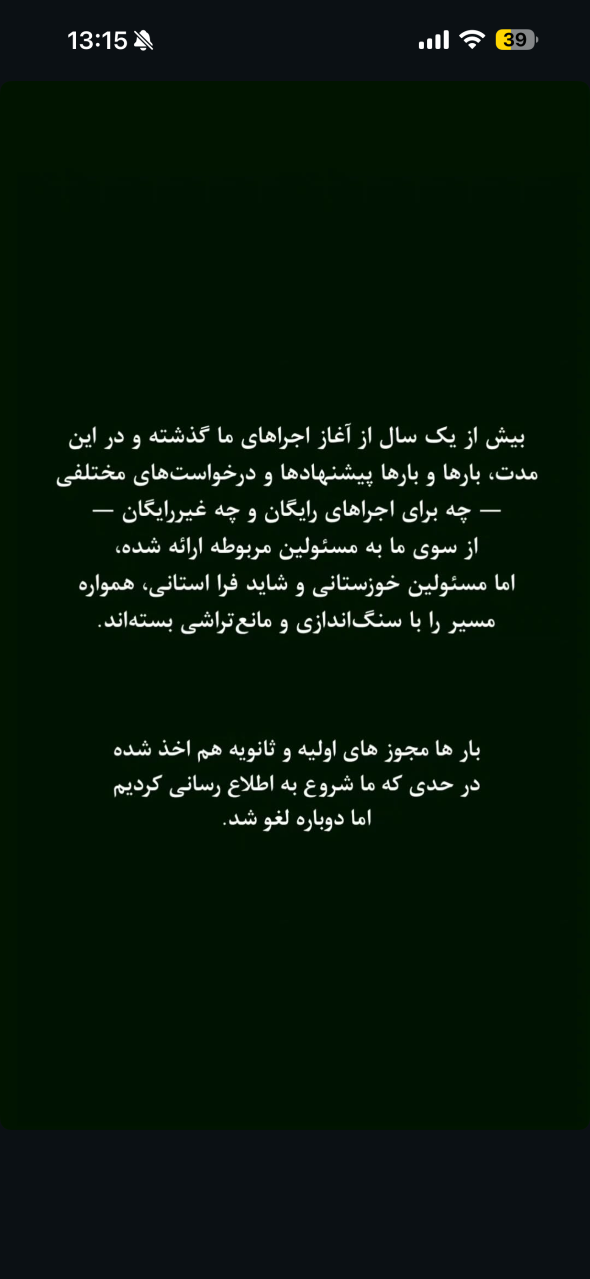 این خواننده در استوریهای خود با لحنی گلایهآمیز نوشت که بیش از یک سال است که پیشنهادهای مختلفی برای اجرا، چه رایگان و چه غیررایگان، به مسئولین خوزستانی ارائه شده، اما همواره با «سنگاندازی» و «مانعتراشی» روبرو شدهاند. او تاکید کرد که حتی مجوزهای اولیه و ثانویه نیز اخذ شده و اطلاعرسانیها آغاز شده بود، اما در نهایت کنسرت لغو شده است.