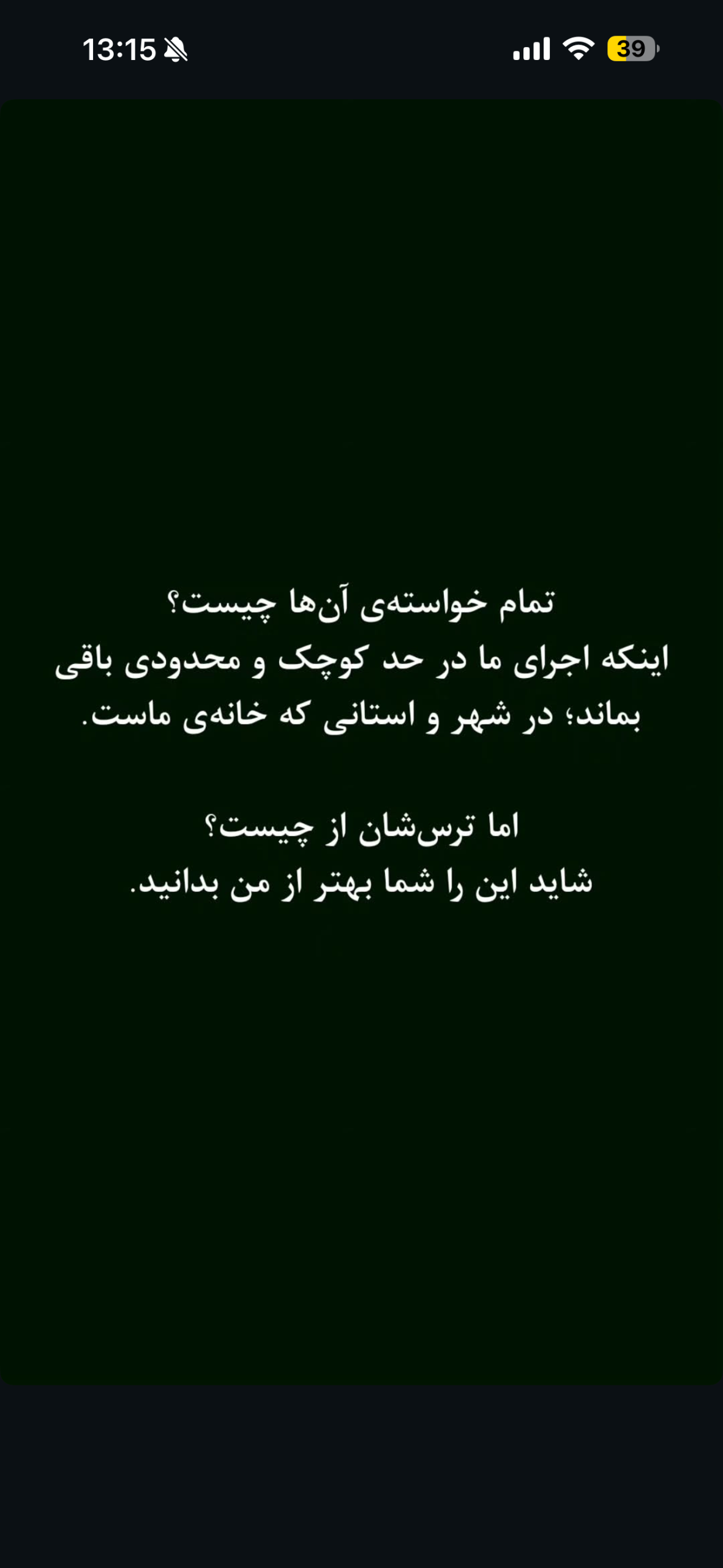 طهماسبی در ادامه با طرح سوالاتی انتقادی، هدف مسئولین را محدود کردن اجرای او در استان خود دانست و از دلیل این «ترس» پرسید. او به بهانههایی مانند عدم برقراری امنیت و عدم تناسب فضا با شأن مردم اشاره کرد که در پاسخ به درخواست اجرای کنسرت در سالنها یا مکانهای بزرگتر مطرح شدهاند.