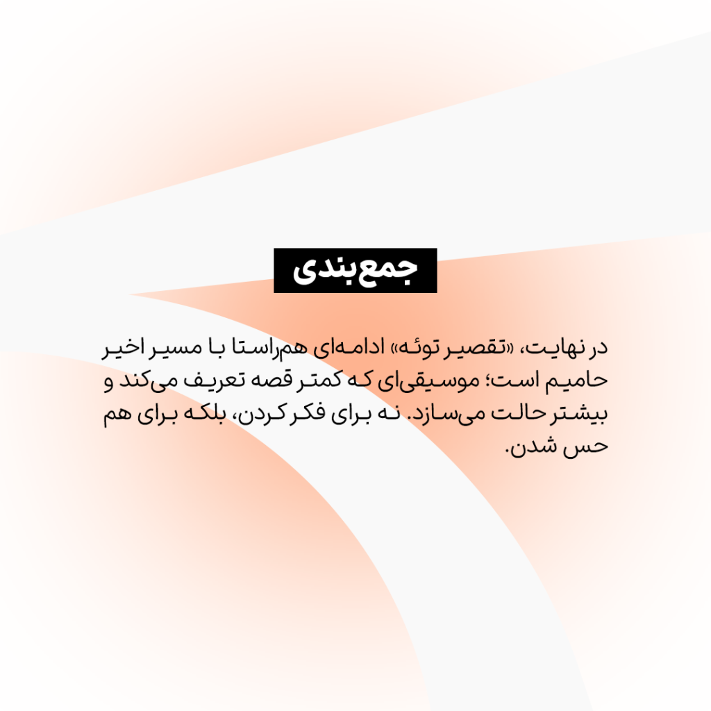 در نهایت، «تقصیر توئه» ادامهای همراستا با مسیر اخیر حامیم است؛ موسیقیای که کمتر قصه تعریف میکند و بیشتر حالت میسازد. نه برای فکر کردن، بلکه برای همحس شدن.