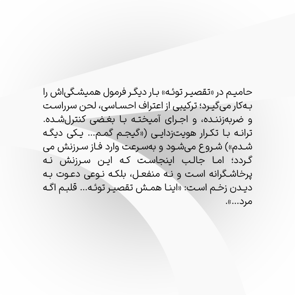 حامیم در «تقصیر توئه» بار دیگر فرمول همیشگیاش را بهکار میگیرد؛ ترکیبی از اعتراف احساسی، لحن سرراست و ضربهزننده، و اجرای آمیخته با بغضی کنترلشده. ترانه با تکرار هویتزدایی («گیجم گمم… یکی دیگه شدم») شروع میشود و بهسرعت وارد فاز سرزنش میگردد؛ اما جالب اینجاست که این سرزنش نه پرخاشگرانه است و نه منفعل، بلکه نوعی دعوت به دیدن زخم است: «اینا همش تقصیر توئه… قلبم اگه مرد…».