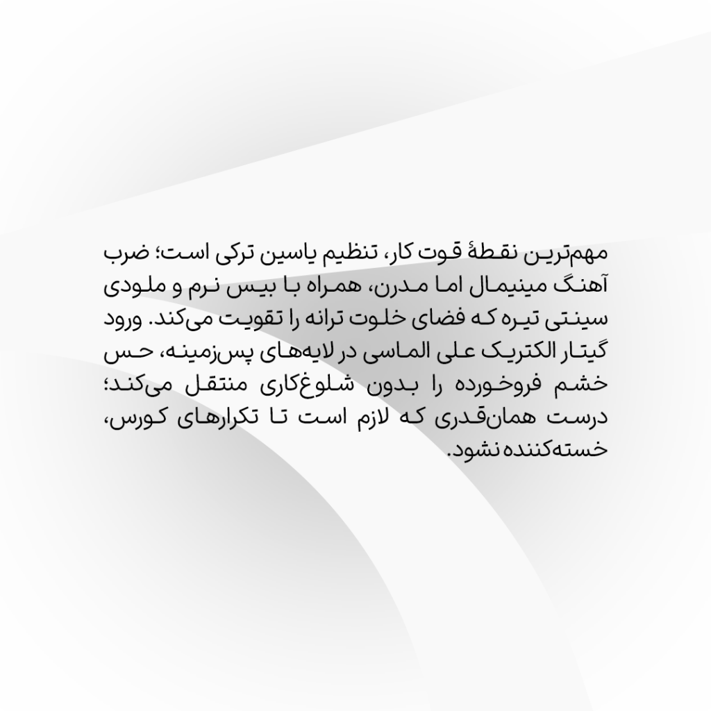 مهمترین نقطهٔ قوت کار، تنظیم یاسین ترکی است؛ ضربآهنگ مینیمال اما مدرن، همراه با بیس نرم و ملودی سینتی تیره که فضای خلوت ترانه را تقویت میکند. ورود گیتار الکتریک علی الماسی در لایههای پسزمینه، حس خشم فروخورده را بدون شلوغکاری منتقل میکند؛ درست همانقدری که لازم است تا تکرارهای کورس، خستهکننده نشود.