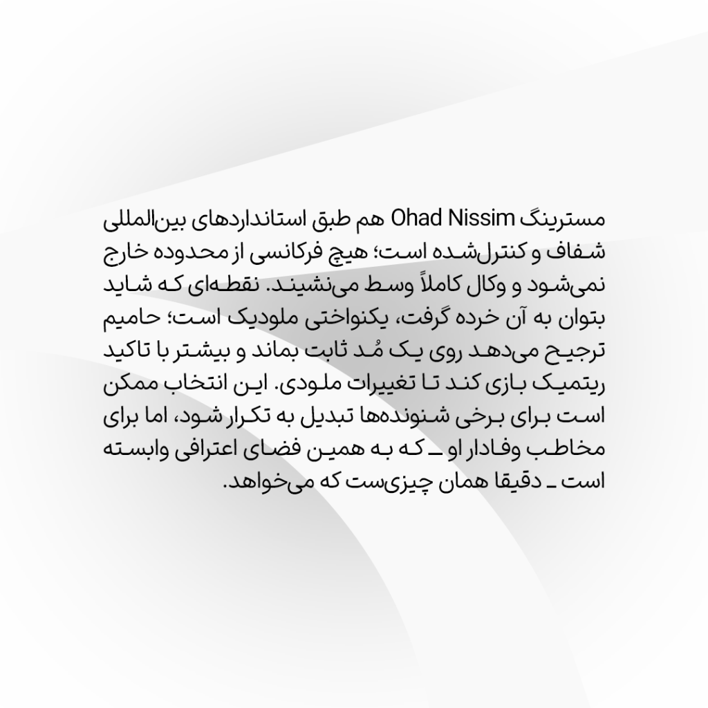 مسترینگ اوهاد نیسیم هم طبق استانداردهای بینالمللی شفاف و کنترلشده است؛ هیچ فرکانسی از محدوده خارج نمیشود و وکال کاملاً وسط مینشیند. نقطهای که شاید بتوان به آن خرده گرفت، یکنواختی ملودیک است؛ حامیم ترجیح میدهد روی یک مُد ثابت بماند و بیشتر با تاکید ریتمیک بازی کند تا تغییرات ملودی. این انتخاب ممکن است برای برخی شنوندهها تبدیل به تکرار شود، اما برای مخاطب وفادار او ــ که به همین فضای اعترافی وابسته است ــ دقیقا همان چیزیست که میخواهد.