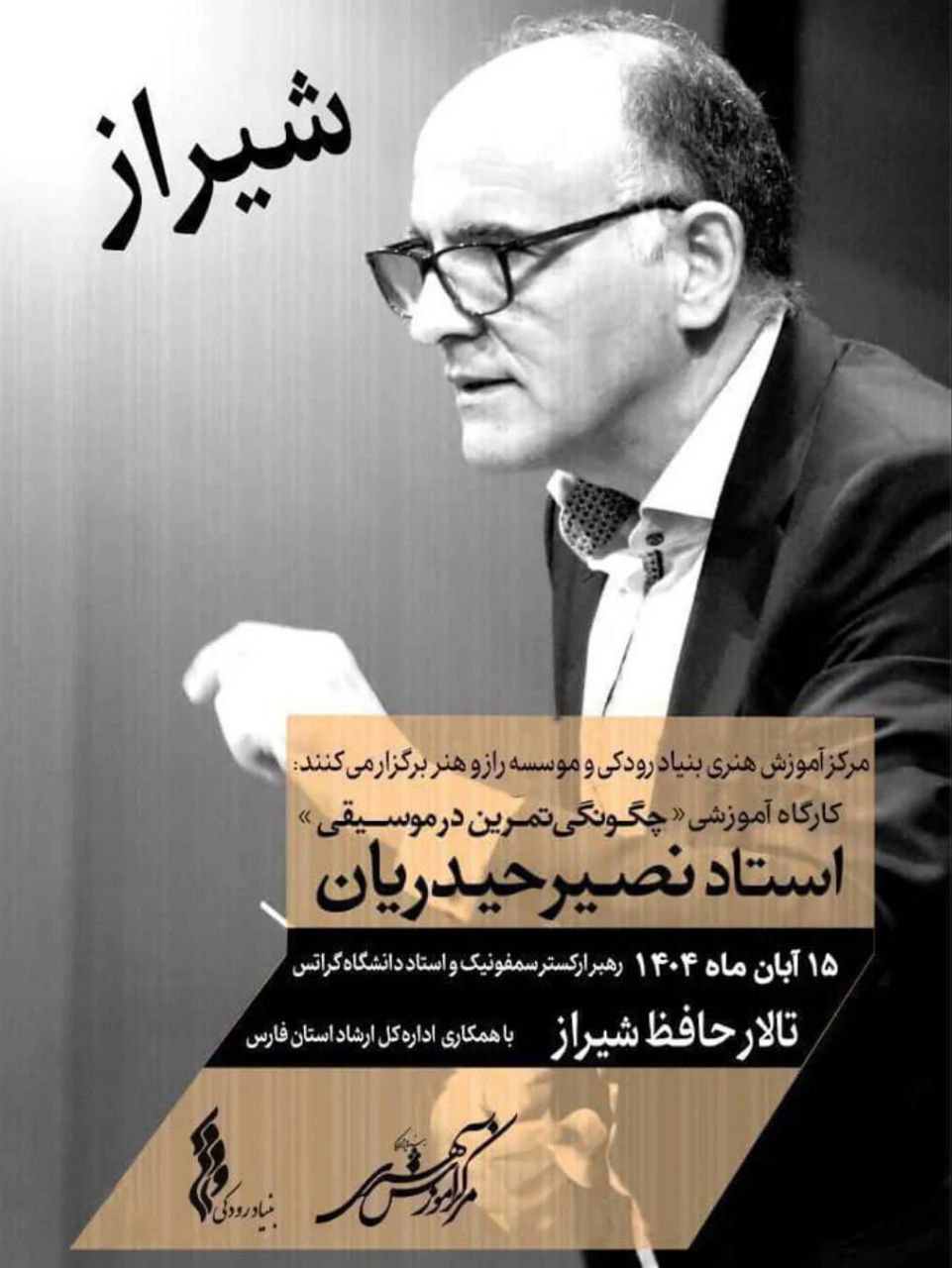 نصیر حیدریان، رهبر برجسته «ارکستر سمفونیک تهران»، ۱۵ آبان ماه در تالار حافظ شهر شیراز، کارگاهی آموزشی با عنوان «چگونگی تمرین در موسیقی» برگزار میکند تا هنرجویان این شهر را با روشهای نوین و اصولی تمرین آشنا سازد. این رویداد فرصتی استثنایی برای علاقهمندان به موسیقی در تمامی سطوح و رشتههاست تا از تجربیات ارزشمند این رهبر ارکستر بهرهمند شوند.